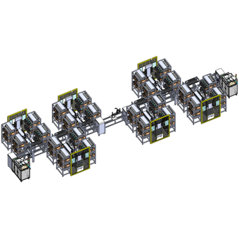 1.前段上料机器人将萃盘中的产品搬送到第一款测试载具上,载具传送至测试工位顶升定位,测试搬送机器人将产品搬送至测试设备内对产品进行测试。